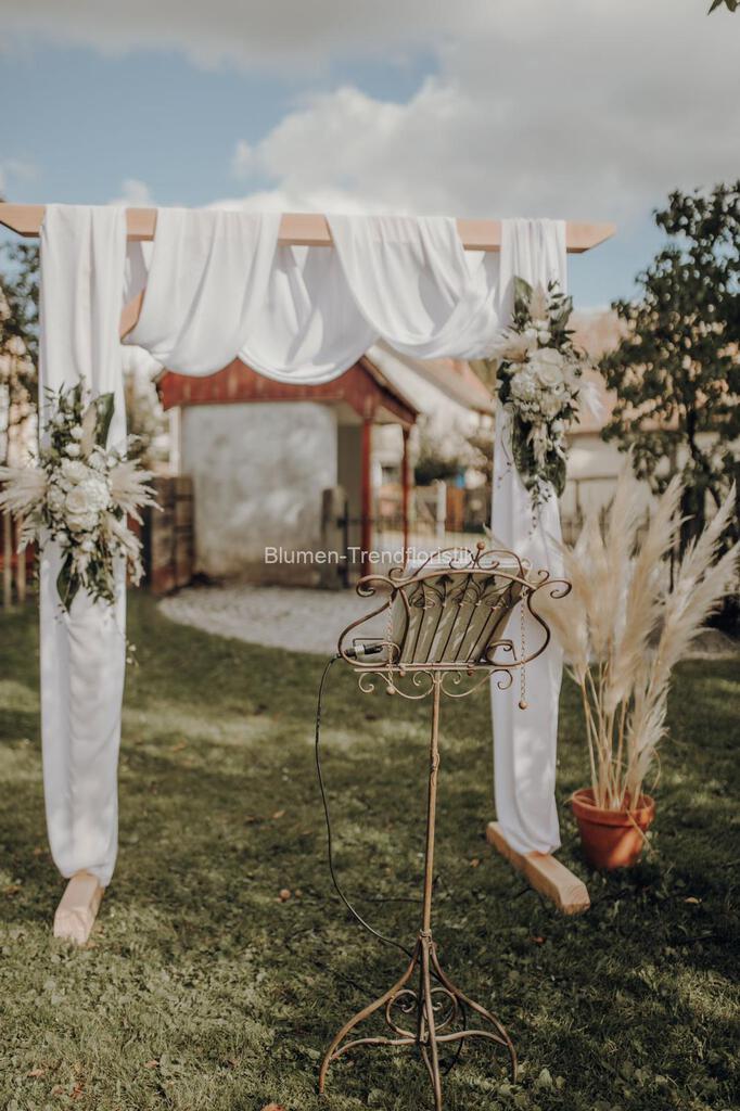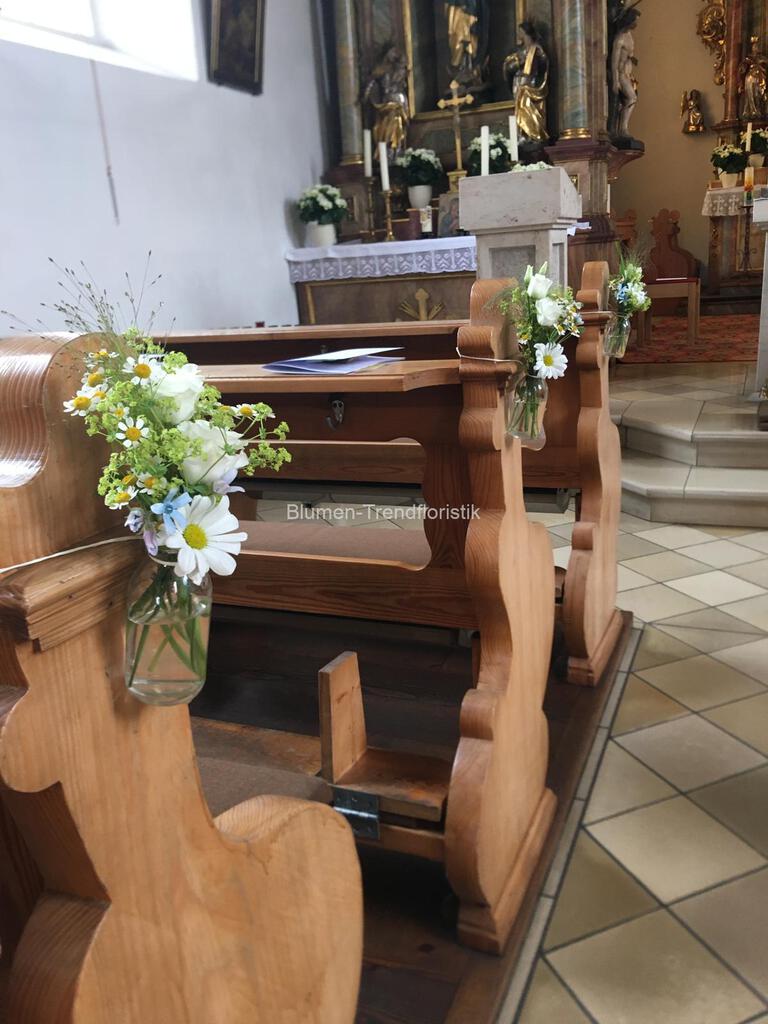 Kirchenschmuck Um das gemeinsame “ Ja“ in einem festlichen Glanz erstrahlen zu lassen, gestalten wir für Sie eine besondere Atmosphäre. Als Blickfang steht das Altargesteck im Vordergrund und ergänzend dazu farblich abgestimmte Banksträuße.